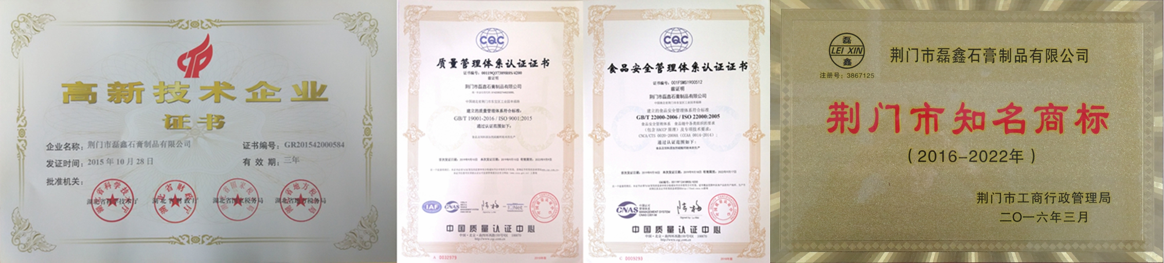 國家高新技術企業!湖北省專精特新中小企業!湖北省支柱產業細分領域隱形冠軍培育企業!湖北省守合同重信用企業!湖北省兩化融合示范企業!荊門市知名商標!中國高純、高白、高亮、超細硫酸鈣(石膏)生產基地!中國取得《食品生產許可證》的食品添加劑硫酸鈣(石膏)供應商!中國取得《飼料添加劑生產許可證》和《產品批準文號》硫酸鈣供應商!中國取得《出口飼料生產、加工、存放企業檢驗檢疫注冊登記證》飼料添加劑硫酸鈣供應商!通過ISO9001國際質量管理體系認證!通過ISO22000國際食品安全管理體系認證!通過HALAL國際清真認證!通過KOSHER猶太認證! 荊門市磊鑫石膏制品有限公司成立于2002年,位于石膏資源富集的湖北省荊門市東寶區工業園幸福路,占地27000余平方米,是一家在業內享有盛譽的集石膏、石膏粉和硫酸鈣制品研發、生產、銷售于一體的高新技術企業。公司擁有 “磊鑫”、“杰普生”、“凱氏蘇特”等5個國家注冊商標,2個發明專利,18個實用新型專利,50余篇自有技術應用研究,36篇權威期刊發表技術論文。主要產品有:醫藥級硫酸鈣、食品級硫酸鈣、飼料添加劑硫酸鈣、人造石透明填充粉,凱色粉、涂料及化妝品功能性填料和特級半水纖膏粉、混合石膏粉、模型石膏粉,建筑石膏粉等九大系列50余種產品。公司享有自營進出口權,客戶遍布全世界,是多家公司、集團和世界500強企業的優秀供應商!產品遠銷到韓國、日本、俄羅斯、中國臺灣、東南亞、歐美、中東、非洲等國家和地區。公司緊靠207國道,焦柳鐵路穿境而過,距漢江碼頭50公里,長江沙市港90公里。交通運輸便利,確保及時供貨?!按脩魹樯系壅\信為本,視質量為生命持之以恒!”是我們的企業宗旨,與我們合作是您明智的選擇,共謀發展是我們共同的目標!歡迎垂詢,歡迎惠顧! Your Trusted Source For Food-Grade Calcium Sulfate!——做全球更好的食品級硫酸鈣(石膏)供應商! ——CGC·磊鑫石膏